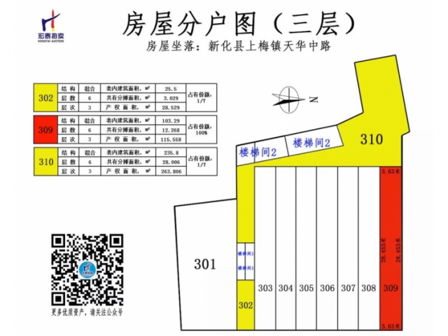 三層商業(yè)房產(chǎn): 302號(產(chǎn)權(quán)占有份額:1/7),309號(產(chǎn)權(quán)占有份 額:100%),310號(產(chǎn)權(quán)占有份額:1/7)。