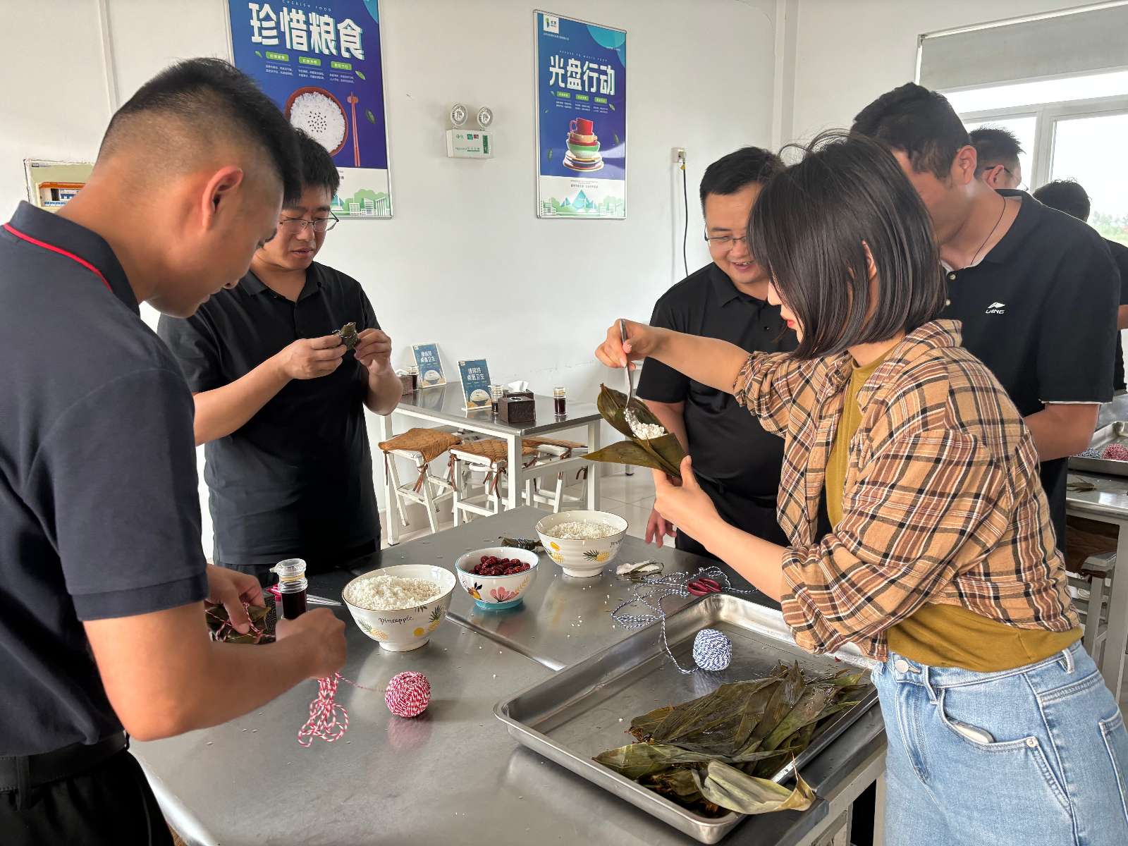 在一片祥和的節(jié)日氛圍中,大家圍攏在桌旁,邊學(xué)邊練,互相協(xié)作,折粽葉、填糯米裹葉子、扎線.......一道道工序有條不紊,忙得不亦樂乎。一張張翠綠的粽葉在手中翩翩起舞,一個個有模有樣的粽子迅速成型,大家手把手傳承著端午節(jié)的傳統(tǒng)文化,共同感受著中華傳統(tǒng)文化的魅力。