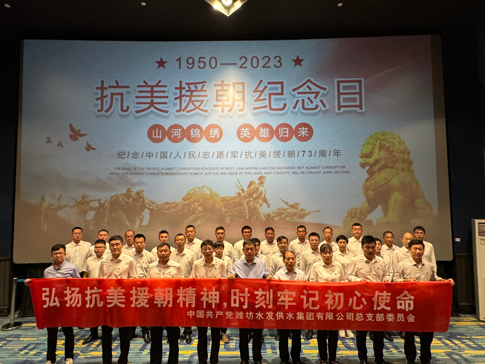 10月25日是抗美援朝73周年紀念日,為教育引導廣大黨員干部弘揚英模精神,重溫先烈英雄事跡,弘揚偉大抗美援朝精神。供水集團黨總支組織開展“弘揚抗美援朝精神 時刻牢記初心使命”主題黨日活動。通過重溫入黨誓詞、觀看愛國主義電影等方式,引導廣大黨員干部弘揚傳承家國情懷,把愛國奮斗內化于心,外化于行。
